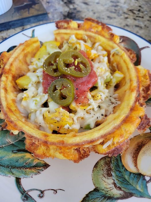 For this breakfast bowl I cooked up two eggs, bacon and cheese. I mixed all the ingredients together. I scooped them into the chaffle bowl topped with little more cheese, jalapeno, avocado and whatever hot sauce you desire. Super simple, super yum and you won’t miss the toast! Easy peasy!