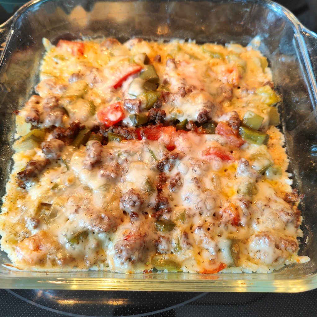 I didn’t have enough bell peppers to make five of them. So I had two green bell peppers and decided to make a casserole instead. This was such an easy meal to make and of course delicious! If you don’t have fresh tomatoes you can always use roasted canned tomatoes. I had an abundance of fresh tomatoes that I needed to use. I also had sliced swiss cheese and placed four slices on top of the casserole. I still mixed shredded mozzarella cheese into the mixture. You don’t have to use swiss cheese on top, it’s just what had so decided to top the casserole with that. I made two of these casseroles, one for the family with rice and the second one had the cauliflower rice. The family is not on board with my low carb healthy eating. I love my Hamburger Meat Chopper makes it quick and easy for chopping up any ground meat, mash potatoes or even avocadoes.
