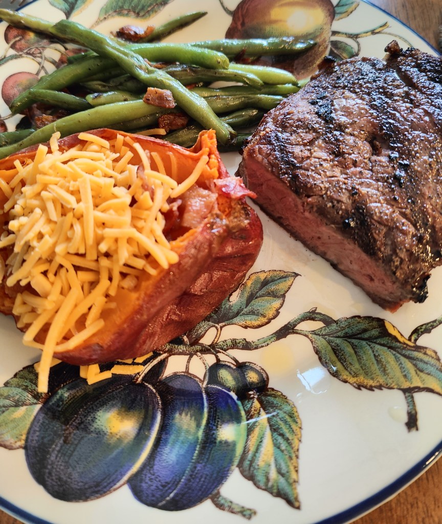 This dinner was so delicious and easy to make. NY steak, sweet potato and bacon sautéed green beans. Can’t get much better than this. The family absolutely loved it!