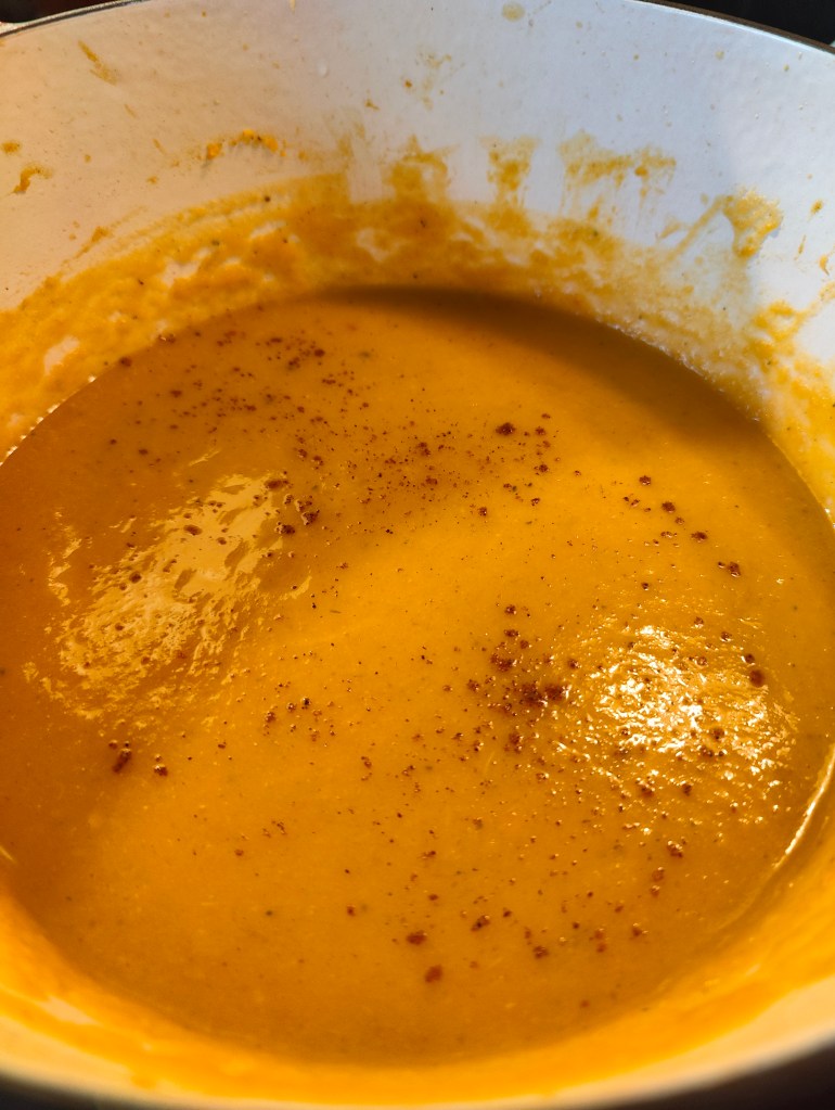 When your squash is done, place it in the pot with the rest of the ingredients. Using an immersion blender, food processor or blender blend until smooth. If the soup becomes too thick add in more broth.